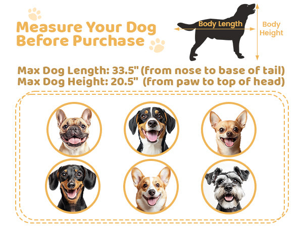 Ideal for French Bulldog, Beagle, Corgi, Shetland Sheepdog, Brittany Spaniel, Basset Hound, and American Pit Bull Terrier, and more (Max: 33.5" body length, 20.5" shoulder height).