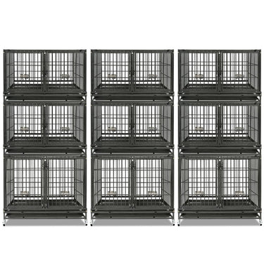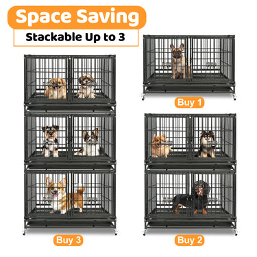 • Adjustable Divider & Bowls: Each 43" crate includes a removable divider for flexible use. Upper crates fit small to medium dogs; the lower crate suits medium to large breeds. Comes with two height-adjustable stainless steel bowls.